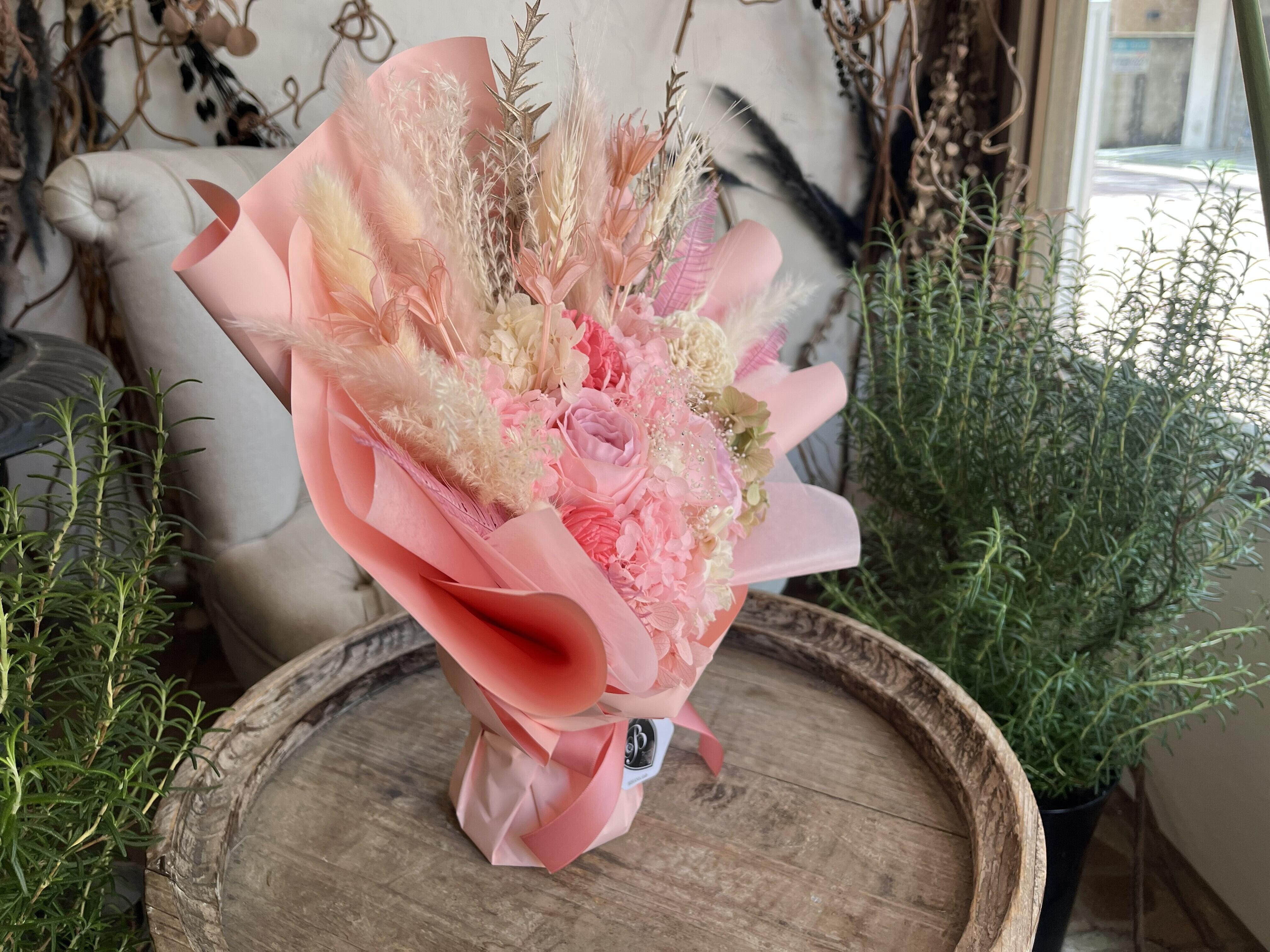 プリザーブドフラワー 花束 ギフト|スタンディングブーケ(花瓶不要)エレガンス・ピンク(Élégance pink)|誕生日・送別・大人の贈り物に